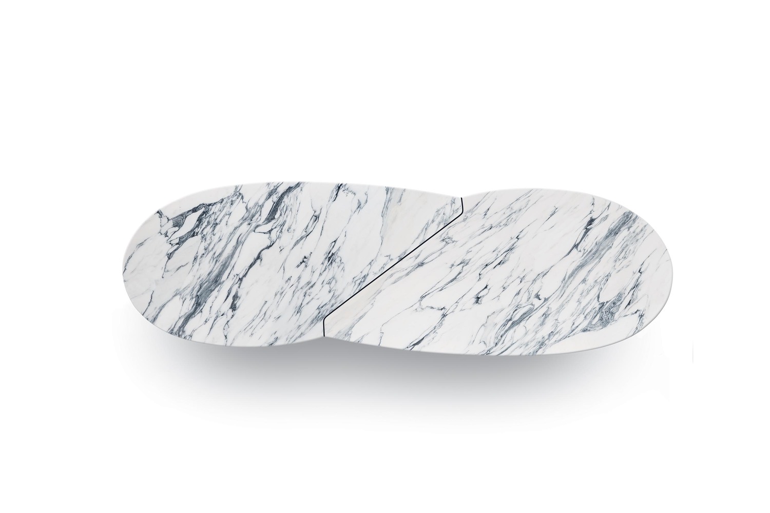 Infinitamente is a limited-edition marble table, available in two versions: the oval-shaped (cm 220×124) and the staggered double oval-shaped (cm 340×120). The top is in polished Bianco Levigliani marble, coated with transparent polyester varnish to improve surface resistance and prevent liquid absorption.