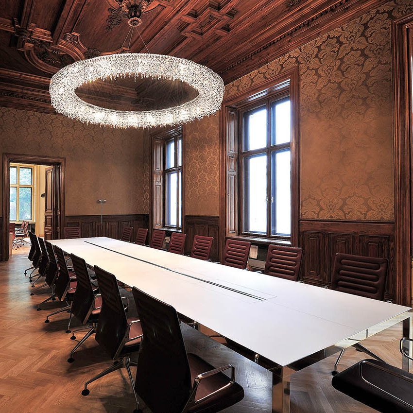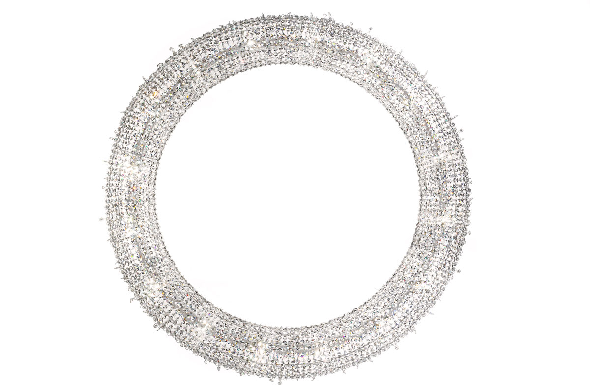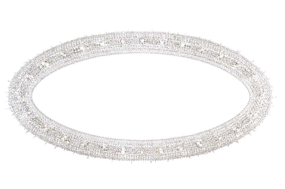 The structure of the Looop crystal chandelier is made of polished stainless steel. The trim is made of full-cut octagonal crystals and pendants in various sizes and shapes.
