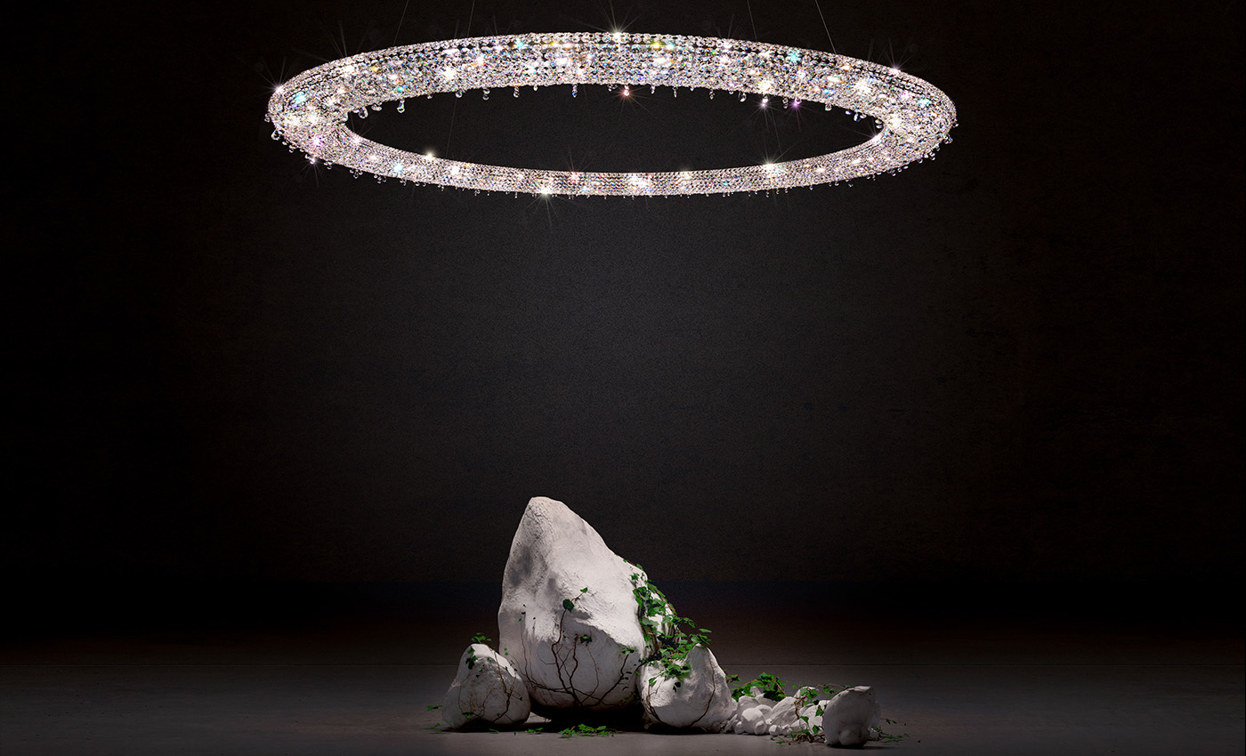 The fixings are platinum-plated nickel rings, while the ceiling rose is made of polished chrome-plated steel.
