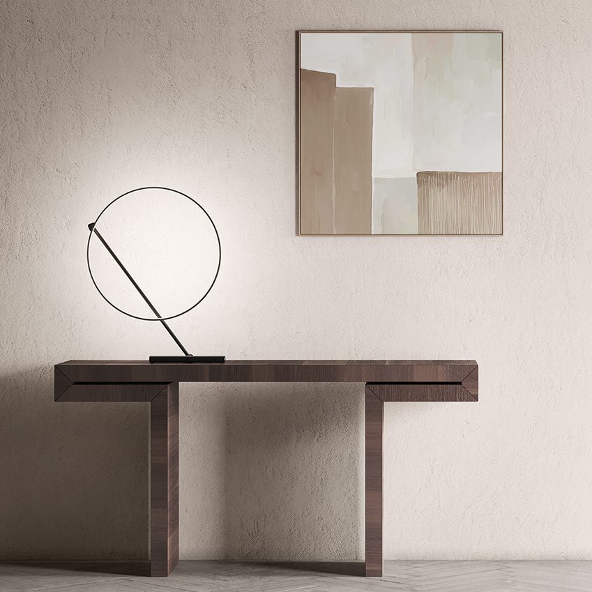 The T-shaped base supports the rod, which is tangent to the circle. The lamp can be arranged in many ways, thus allowing the owner to configure it differently every time.