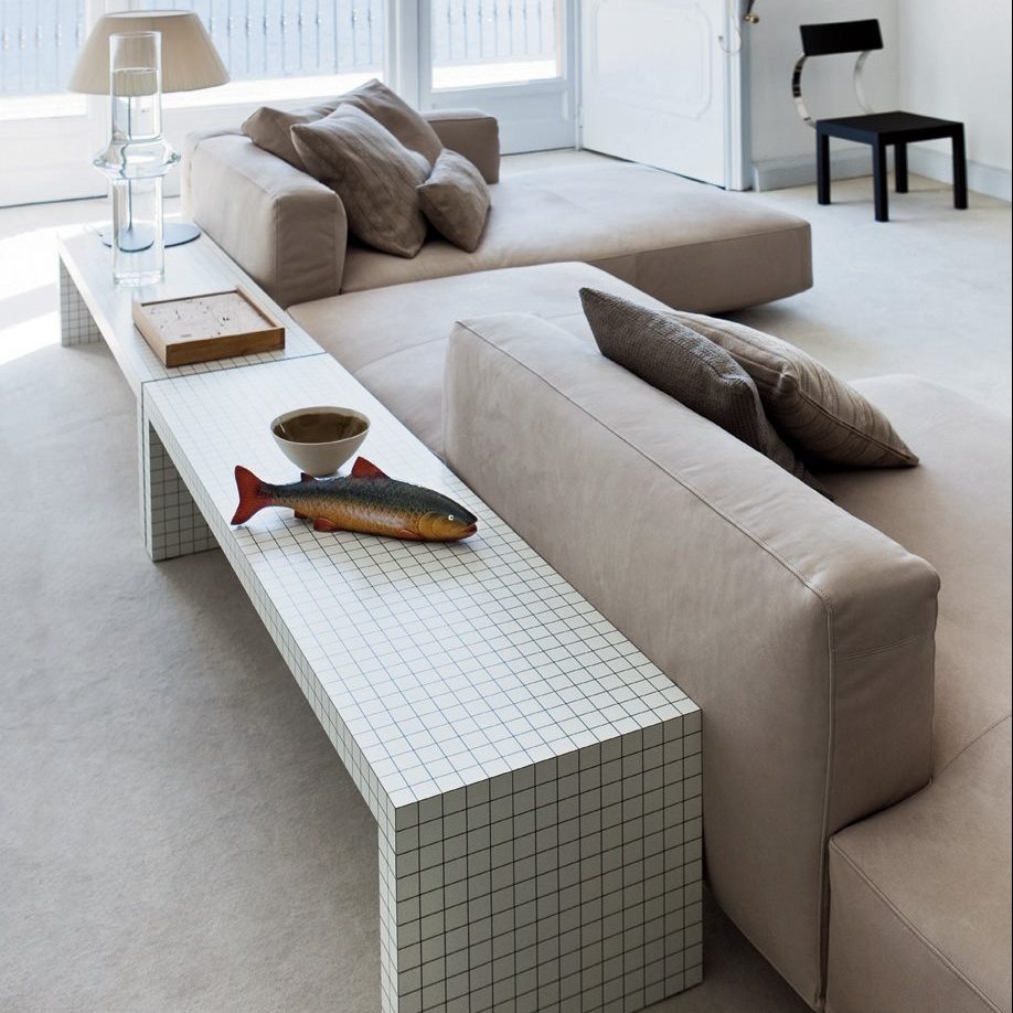 Zanotta’s Quaderna coffee table and console table have a honeycomb core structure coated with white Print laminate, with a black squared digital print, with a 3 cm centre distance.