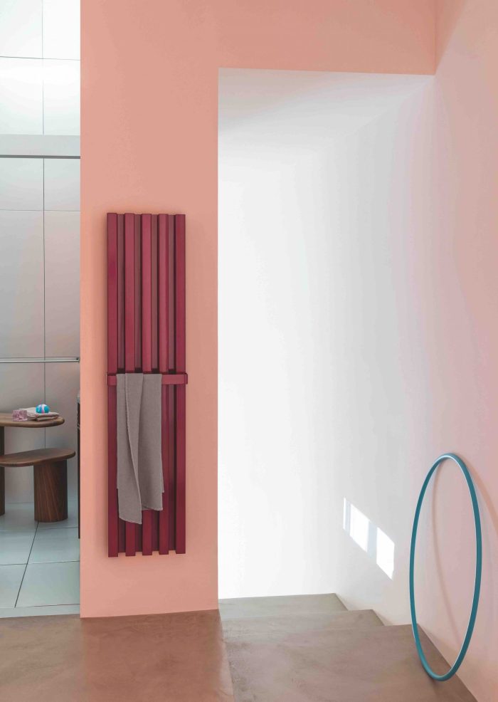 Soho Bathroom heater by Tubes is available in a vertical single-pillar version and is distinguished by a special handle that serves as a towel rack. This handle can be freely placed at any height within the radiator, providing convenience and practicality in daily use. In addition, the radiator features an elegant clothes hanger, completing the line of accessories specifically designed for the bathroom environment.