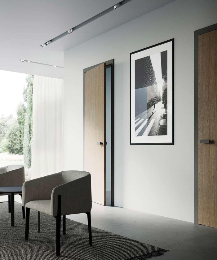 The Tesa swing door from ADL is distinguished by a number of distinctive features. The 38 mm thick wooden door offers a feeling of solidity and natural beauty. The recessed aluminum handle adds a touch of elegance and cleanliness to the overall design. The range of jamb options allows for complete customization, from traditional aluminum with jamb covers to more integrated solutions such as rasomuro with plasterboard or wood paneling.